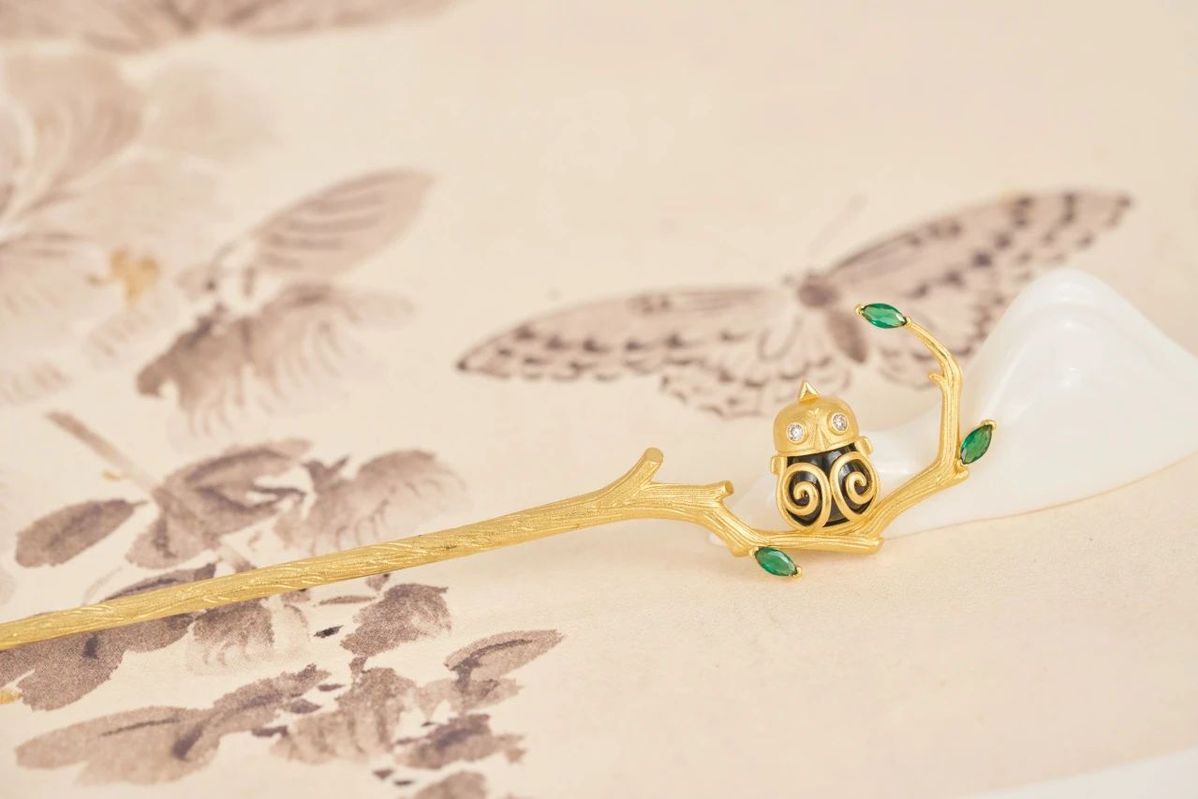 Gold-plated hairpin decorated with an owl motif inspired by the bronze owl-shaped
