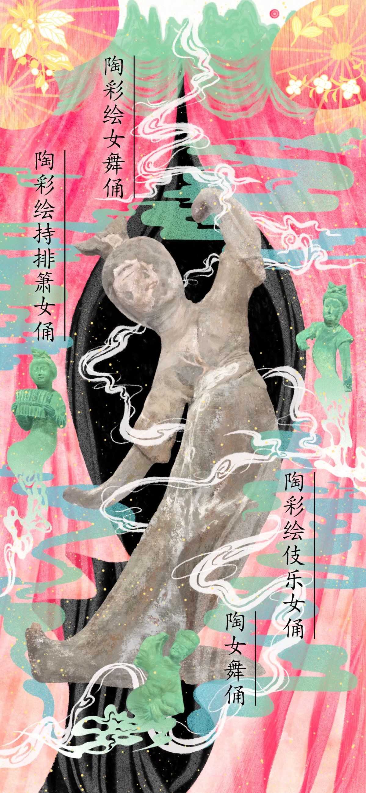 Painted pottery female figurine holding a pan flute (first row from top, first from left), painted pottery female dancer figurine (first row from top, middle), painted pottery female dance performer figurine (first row from top, first from right), and pottery female dancer figurine (first from bottom) [Photo/provided to chinaservicesinfo.com]