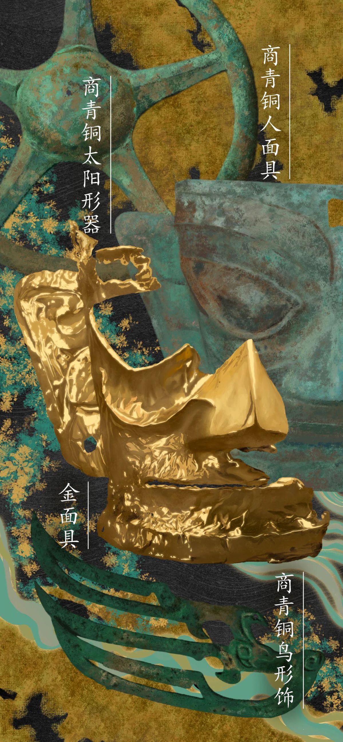 Shang Dynasty (c.16th century-11th century BC) sun-shaped bronze item (first from top), Shang Dynasty bronze mask (second from top), golden mask (third from top), and Shang Dynasty bird-shaped bronze accessory (fourth from top) [Photo/provided to chinaservicesinfo.com]