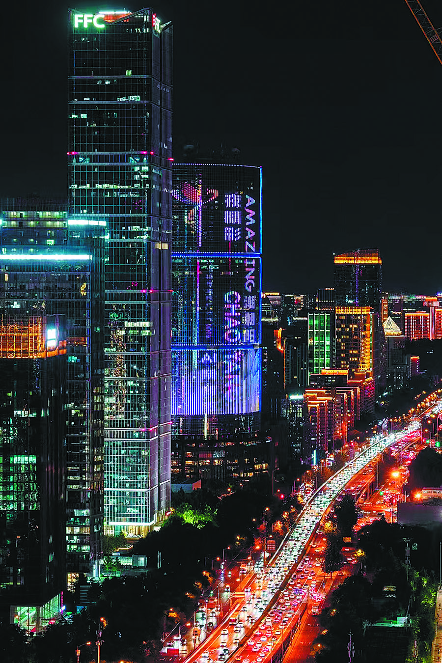 Buildings in Chaoyang district come alive at night, with colorful illuminations and light performances, such as those in Wangjing area, the central business district, the Liangma River economic belt, and the Sanlitun subdistrict, which is a shopping, dining and nightlife hub. [Photo provided to China Daily]