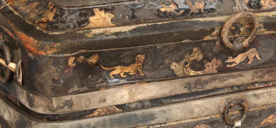 Close-up of the cloud and animal patterns in gold and silver foil on the makeup box [Photo/Official WeChat account of Nanchang Relic Museum for Haihun Principality of Han Dynasty]