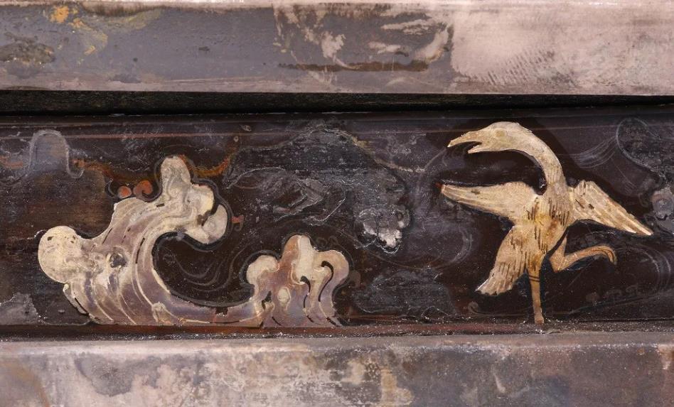 Close-up of the cloud and crane patterns in gold and silver foil on the makeup box [Photo/Official WeChat account of Nanchang Relic Museum for Haihun Principality of Han Dynasty]