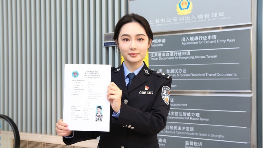 An officer from the Shanghai Municipal Public Security Bureau's Exit-Entry Administration holds an e-port visa confirmation letter. [Photo/Shanghai Observer]