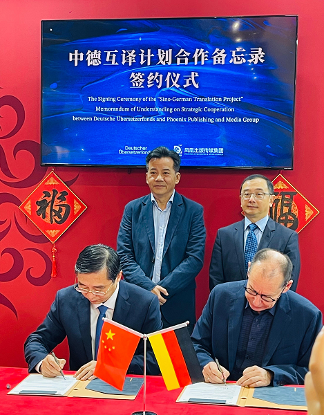 Zhang Chaoyang, president of Phoenix Publishing and Media Group, and Juergen Jakob Becker, the managing director of the Deutsche Ubersetzerfonds (German translators fund), signed the Memorandum of Understanding on Strategic Cooperation for a Sino-German translation project at the 76th Frankfurt Book Fair that closed on Oct 20.