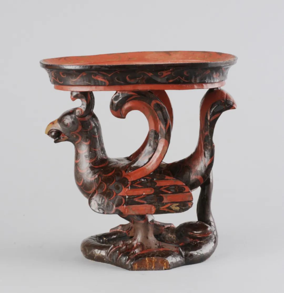 This stunning example of dou is datable to the Warring States Period (475-221 BC), featuring a red and black lacquered design of a phoenix holding a pearl in its mouth, with a coiled snake forming its base. This unique design beautifully merges function with artistry, reflecting the aesthetic sensibilities of the Chu State that ruled over a vast area including present-day Anhui province. Collection: Anhui Museum.