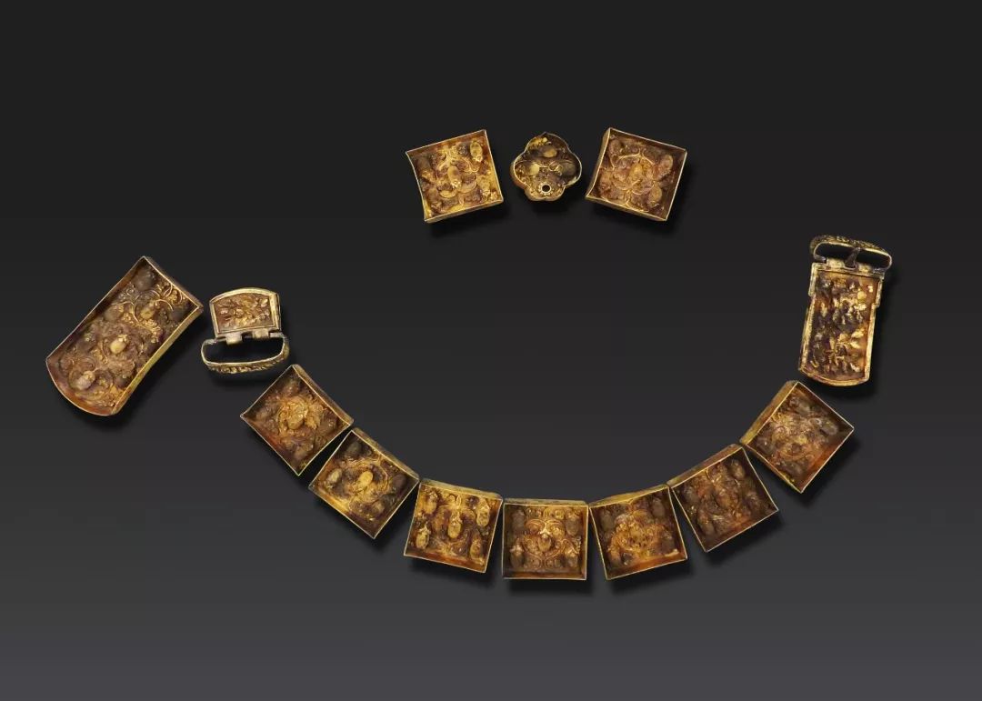 These remarkable belt accessories, acclaimed as the "Top Belt of the Song Dynasty", once belonged to Guo Zhizhang (1039-1114), a Northern Song Dynasty (960-1127) high-ranking official. Their intricate design showcases the highest craftsmanship of the era, featuring 10 decorative plaques adorning the surface, one sheath at the end and two gold buckles connecting the belt.