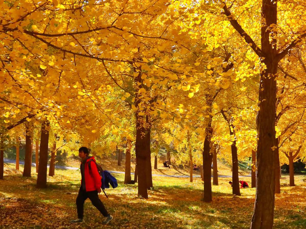 A tourist strolls through the gingko forest at the China National Botanical Garden (North Garden) in Beijing, capital of China, Nov 3, 2024. [Photo by Jiang Dong/chinadaily.com.cn]