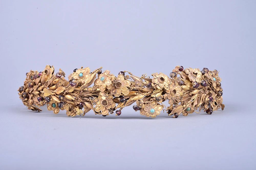 Gold crown accessory embedded with gem, Han Dynasty (206 BC-AD 220), from the collection of Inner Mongolia Museum [Photo/Official WeChat account of Shanghai Museum]