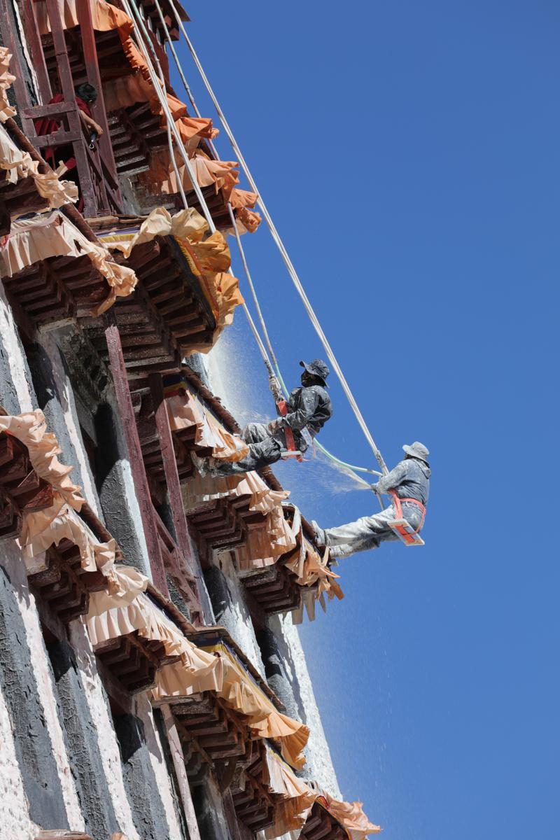Thousands of residents in Lhasa joined the work in painting the exterior walls of the Potala Palace, an annual routine "makeover" project for the UNESCO World Heritage site. [Photo by Palden Nyima/chinadaily.com.cn]