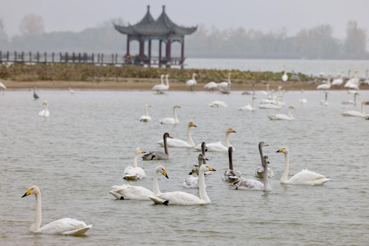 In recent days, tourists and photographers were glad to see hundreds of wild white swans gathering at Shengtian Lake in Ruicheng county of Yuncheng city, Shanxi province.