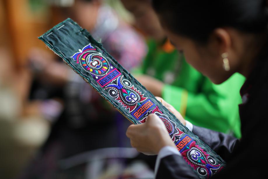 Villagers embroider for the hundred-bird coat. [Photo/Converged Media Center of Danzhai County]