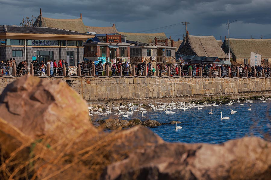 Out-of-town tourists come to see whooper swans.[Photo provided to chinadaily.com.cn]