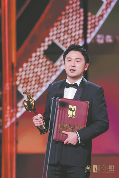 Lei Jiayin displays the Best Actor Award. [Photo provided to China Daily]