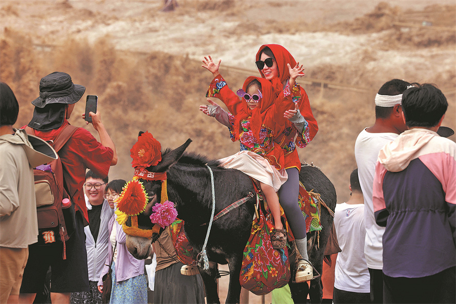 Tourists ride on a donkey in front of the Hukou Waterfall on the Yellow River in Jixian county. ZHU XINGXIN/CHINA DAILY