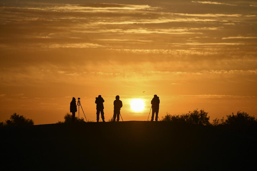 This photo taken on Nov 7, 2024 shows tourists taking photos of the sunrise at the scenic spot in the former site of Daliyabuyi village, Yutian county of Northwest China's Xinjiang Uygur autonomous region. [Photo/Xinhua]