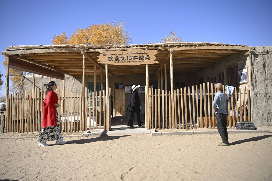 This photo taken on Nov 7, 2024 shows tourists visiting an old house of a villager at the scenic spot in the former site of Daliyabuyi village, Yutian county of Northwest China's Xinjiang Uygur autonomous region. Daliyabuyi village was once located in the heart of the Taklimakan Desert. [Photo/Xinhua]