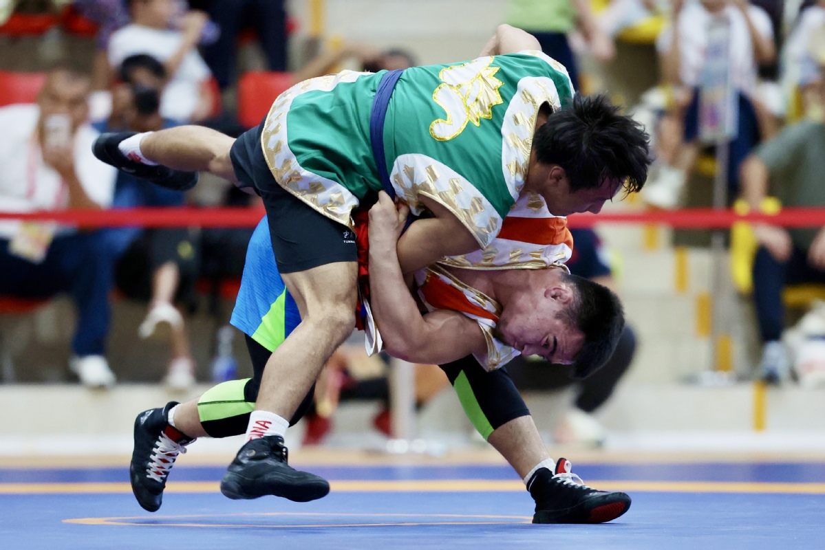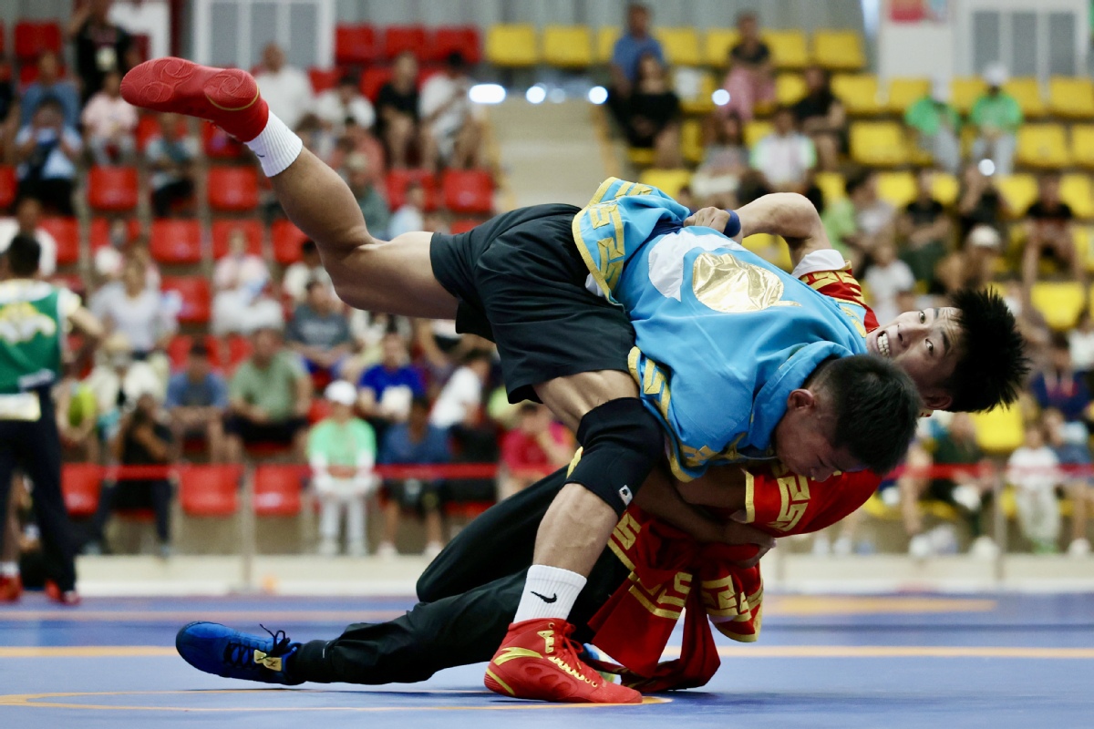 Contestants compete in a Uygur wrestling match during the 12th National Traditional Games of Ethnic Minorities of the People's Republic of China on Nov 24, 2024 in Sanya, South China's Hainan province. [Photo by Wei Xiaohao/chinadaily.com.cn]