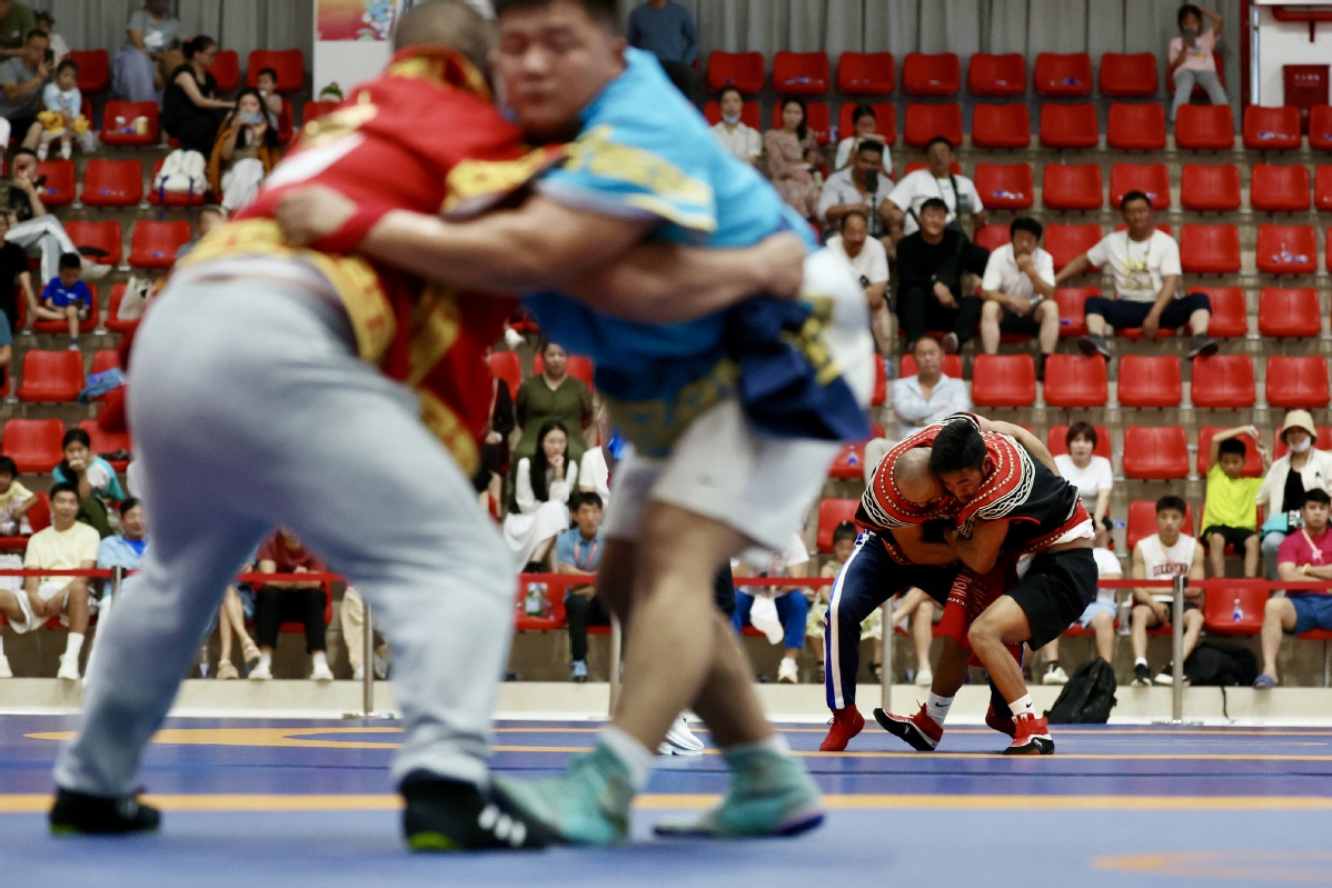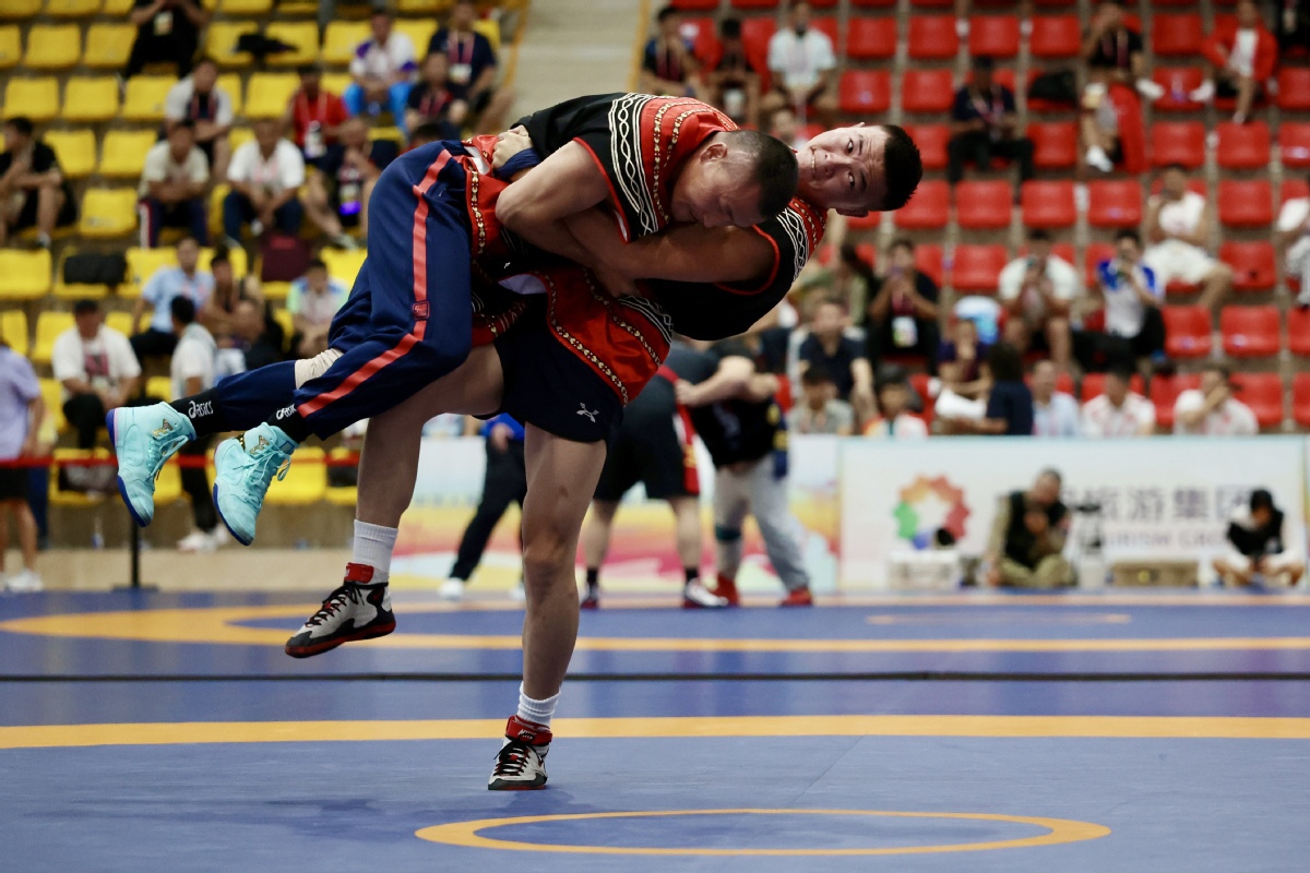 Contestants compete in the Yi wrestling and the Tibetan wrestling matches during the 12th National Traditional Games of Ethnic Minorities of the People's Republic of China on Nov 24, 2024 in Sanya, South China's Hainan province. [Photo by Wei Xiaohao/chinadaily.com.cn]