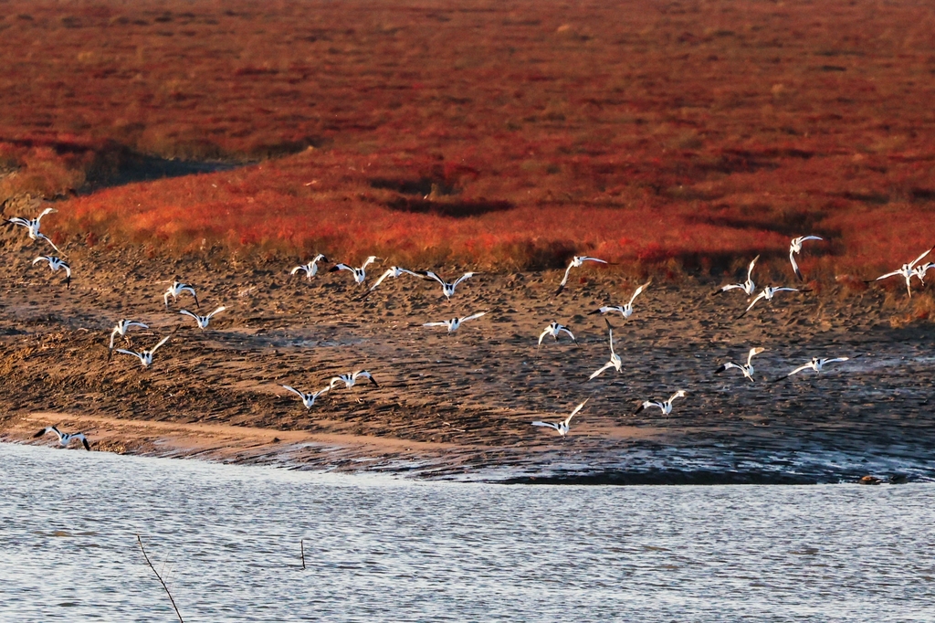 On the Wuhekou Red Beach in Qingdao, Shandong province, the intertwining winter breeze and sea breeze create a stunning scene. The red seepweed, tinted golden by the winter sunlight, bursts with vibrant colors. Seabirds gracefully soar amid the woven beauty of river grasses, crafting a breathtaking picture of nature.