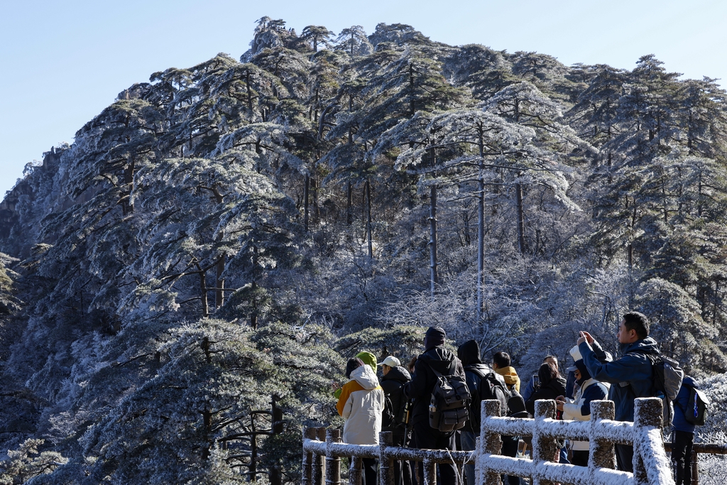 Huangshan Mountain in East China’s Anhui province was transformed into a winter wonderland yesterday. The majestic pine trees and unique rock formations were beautifully covered in snow, shimmering like a crystal fairyland under the warm winter sunlight.