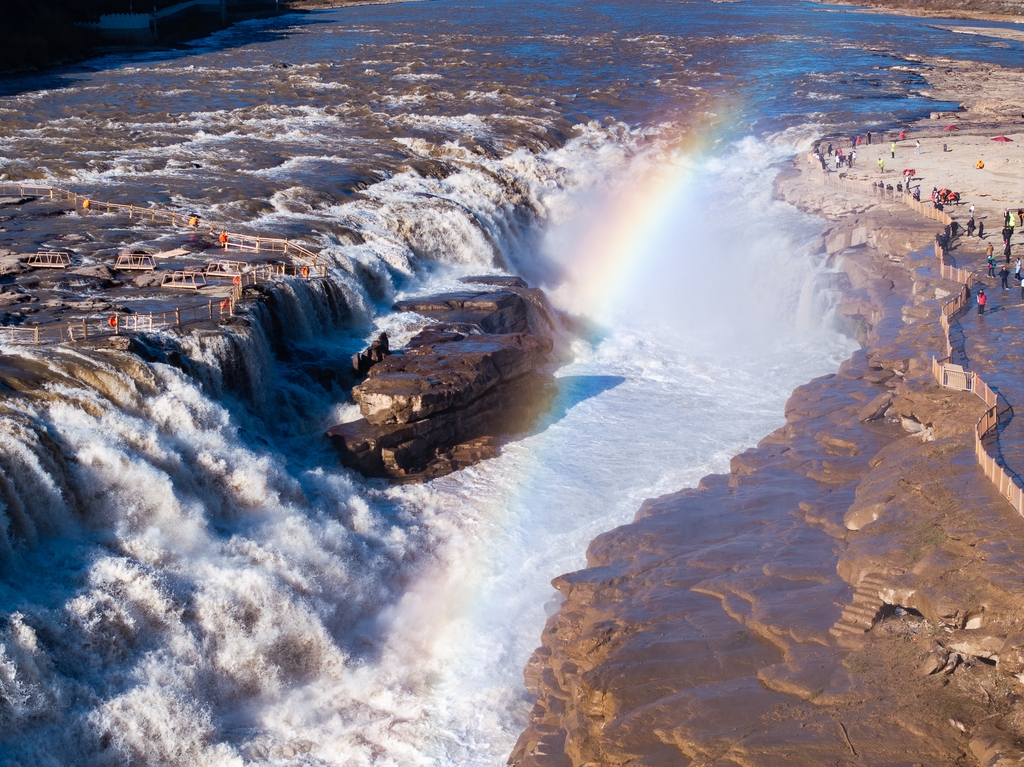 The Hukou Waterfall on the Yellow River, straddling Shanxi and Shaanxi provinces, was a breathtaking sight yesterday! Thanks to increased water flow from reservoir releases, the mist rising from the falls caught the sunlight, forming a magnificent rainbow.