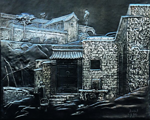 Although she found the work challenging, like when she injured her hands while working with a hammer, Guo Mohan never considered giving up. With support and guidance from her father, Guo Mohan gradually grasped the skills needed to complete iron-based crafts. Guo Mohan is one of very few women artists who have mastered the techniques used to make embossed iron plates. Many of her artworks have received State-level and/or provincial-level prizes.