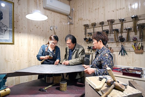 At the invitation of Hebei Vocational University of Industry and Technology (HBCIT, formerly Hebei College of Industry and Technology), Guo Haibo and Guo Mohan established an art gallery on the campus in July 2018, to promote the protection and inheritance of embossed iron plates. Guo Haibo was hired as a guest professor, and his daughter, a full-time teacher. By teaching the techniques used to make iron crafts, they have helped foster the spirit of craftsmanship among college students.