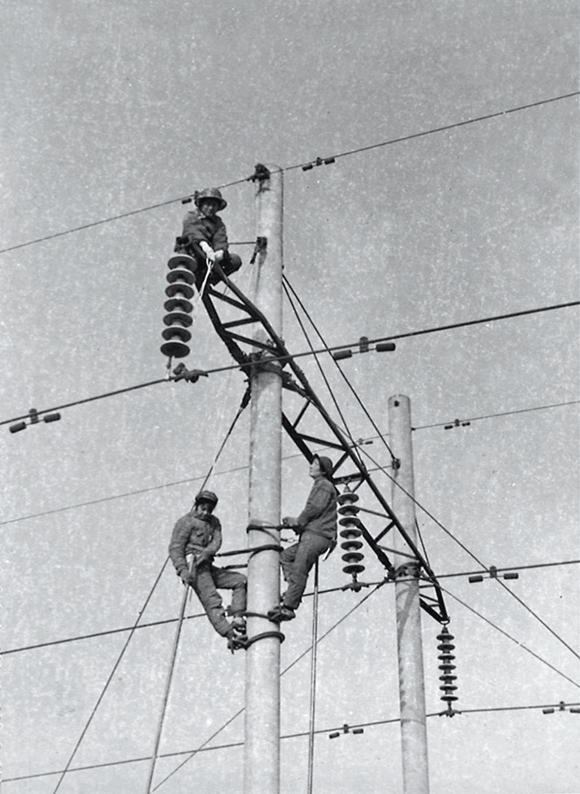 A photo taken in the 1970s, recording the March 8th live-line work team