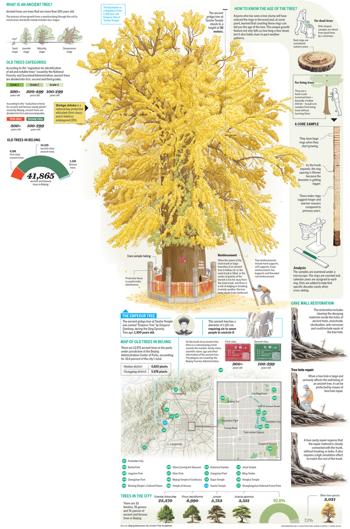 A survey reveals that Beijing is home to 41,865 ancient and valuable trees, of which 6,198(15 percent) are classified as first-grade ancient trees and 34,329 (82 percent) as second-grade ancient trees. First-grade ancient trees are more than 300 years old, while second-grade trees range from 100 to 299 years.