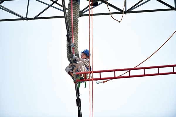 Liu joined State Grid's workforce, in Tianjin, in August 2015. She still remembers the first time she climbed an electric tower. "The first time I attempted to climb the tower, when I was looking up, the iron structure seemed to be leaning toward me. After I had climbed over 10 meters, my heart was pounding heavily, my breath quickened and my palms were sweating. I was too nervous to move my feet and take one more step …