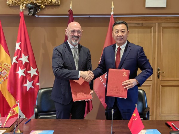 Zhang Donggang (right), Party secretary of Renmin University of China, and Joaquín Goyache Goñi, rector of Complutense University of Madrid, jointly signed a cooperation agreement between the two universities. [Photo provided to chinadaily.com.cn]