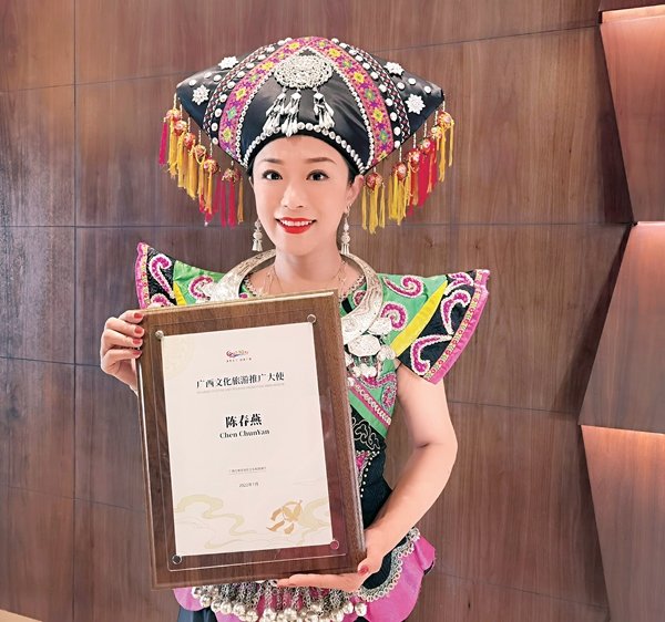 Songs performed by Liusanjie ("Third Sister Liu"), a legendary folk singer, have been among the memories of several generations of Chinese. Chen Chunyan, a national, firstclass performer, and who is an ethnic Yao woman, has been dubbed "Liusanjie of the new generation." Through her songs, Chen has helped promote the colorful ethnic cultures in South China's Guangxi Zhuang Autonomous Region to the world. As head of Nanning Mass Art Center (in Nanning, capital of Guangxi), she has led a team of volunteers in organizing various cultural and arts activities.