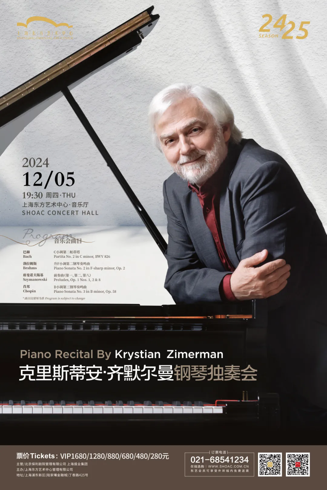 Piano maestro Krystian Zimerman will return to Shanghai Oriental Art Center with masterpieces by Bach, Brahms, and Chopin on Dec 5! The evening marks Zimerman's birthday, with a special post-concert meet-and-greet session for fans to connect with the legend. Don’t miss this unforgettable musical celebration!