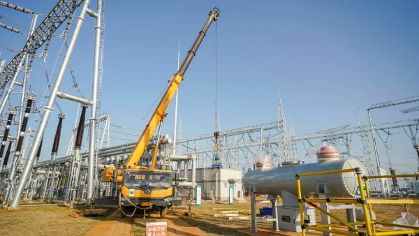 The maintenance personnel of State Grid Anhui Extra High Voltage Company use a crane to carry out the circuit breaker replacement operation on Jan 27. [Photo provided to chinadaily.com.cn]