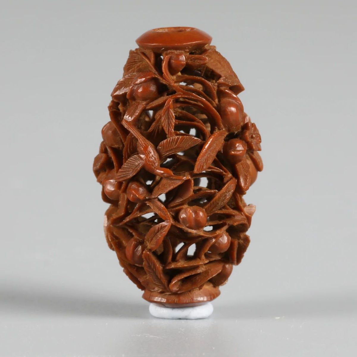 A nut carving of an Amur paradise flycatcher and flowers, middle Qing Dynasty [Photo/Official WeChat account of the Museum of Wu]