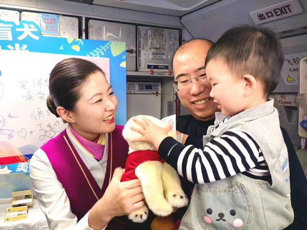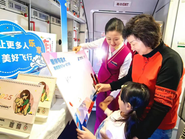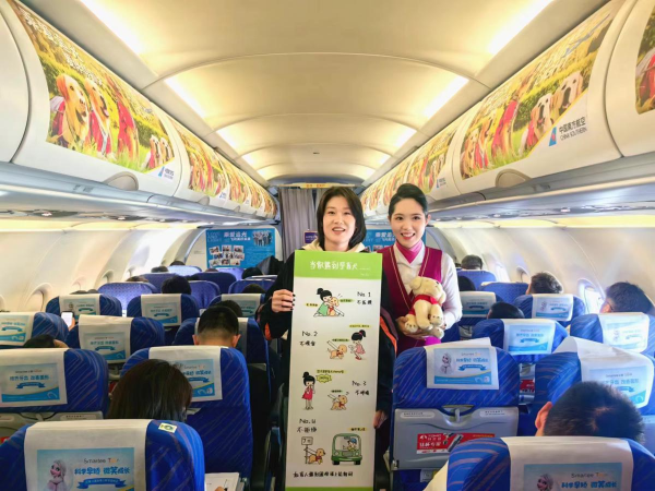 Flight attendants shared with passengers stories about the airline's connection with guide dogs and a volunteer service project. Staff from the guide dog base in Dalian provided insights into the training and daily tasks of guide dogs.