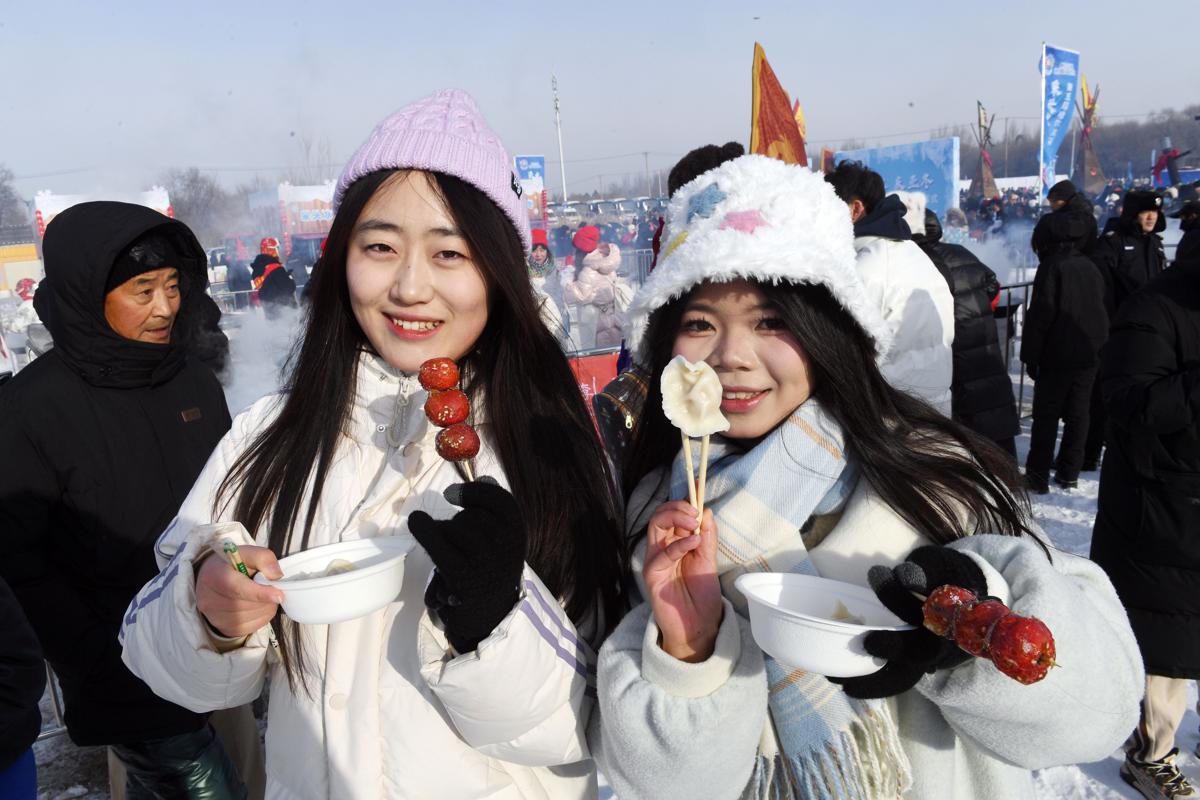 Tourists taste local specialties at the 5th Ice Harvest Festival on Saturday on the frozen Songhua River in Harbin, Heilongjiang province. [Photo by Liu Yang/For chinadaily.com.cn]