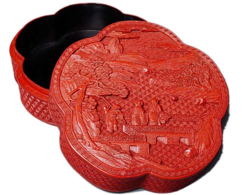 Red-lacquer plum blossom-shaped box decorated with landscape and figure story motifs, Qing Dynasty (1644-1911) [Photo/Official WeChat account of Guangdong Museum]