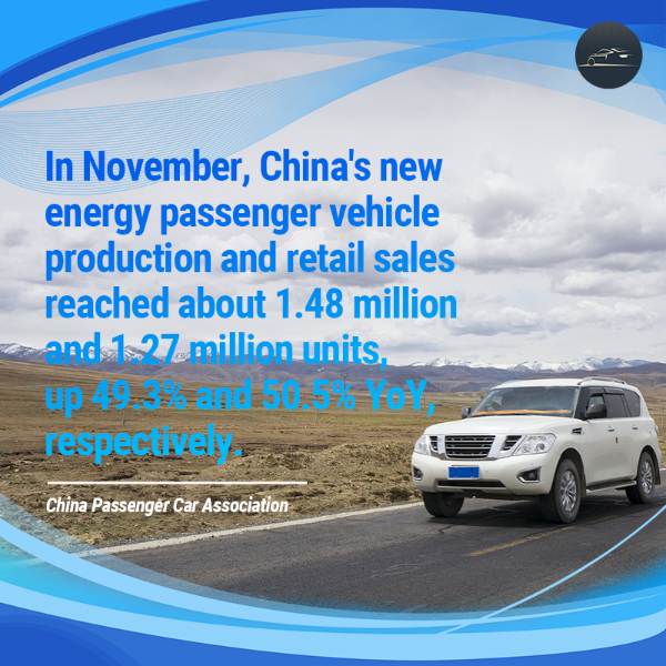 In November, production of new energy passenger vehicles reached about 1.48 million units, representing a 49.3 percent year-on-year increase and a 7.1 percent rise from the previous month.