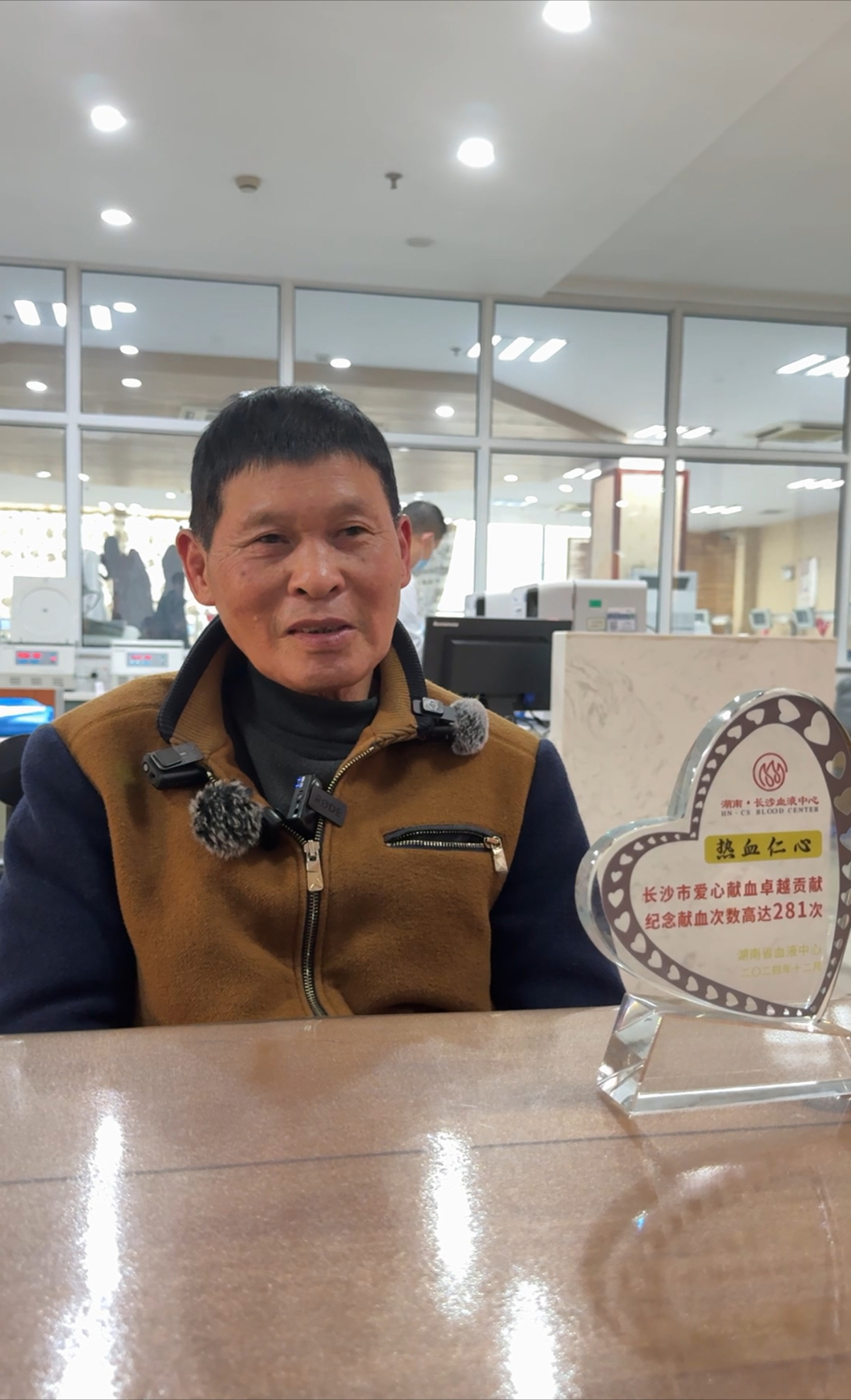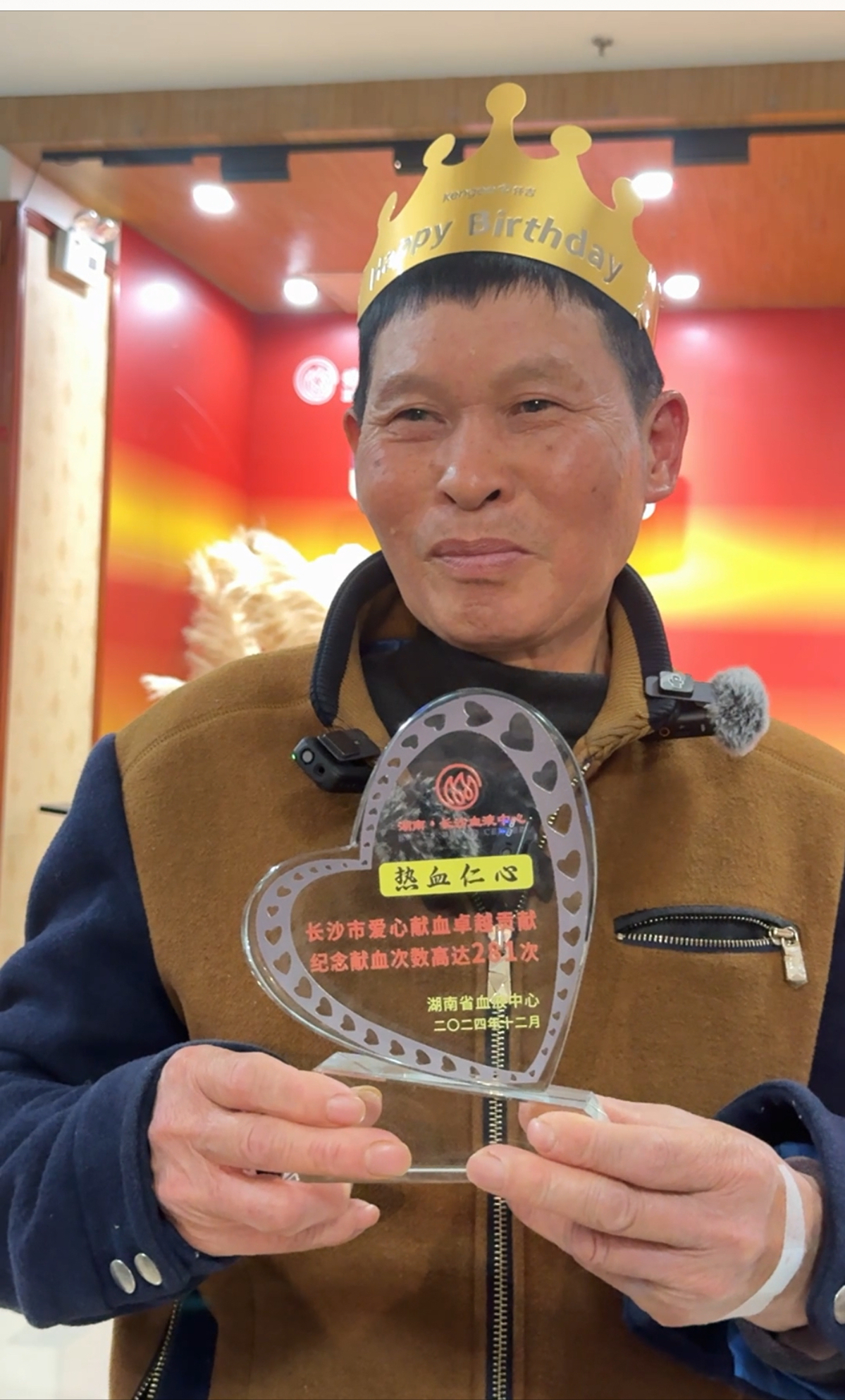 On his 60th birthday, Liu Haisha donated blood for the 281st time and the last time in Changsha, Hunan province. The law stipulates that the oldest age for blood donation is 60.