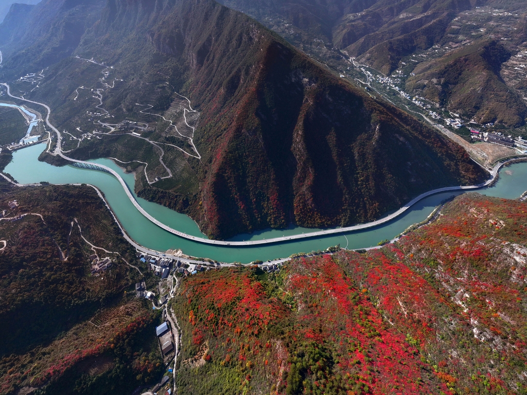 In Yichang, Hubei province, the Guzhao Highway located in the Three Gorges Reservoir area, winds gracefully above the emerald waters of the canyon. Paired with the vibrant red leaves along the banks, it creates a breathtaking ecological masterpiece.