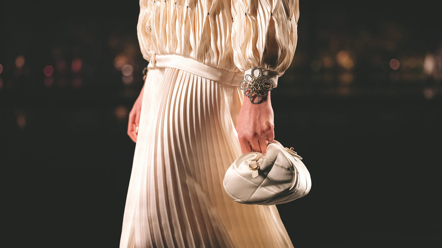 The fluidity of water is reflected in velvet reworked with Chanel's signature camellias; delicate pleats evoke the folds of traditional Chinese fans. Materials like silk and lacquer-inspired textures nod to the city's role as a crossroads of tradition and innovation.
