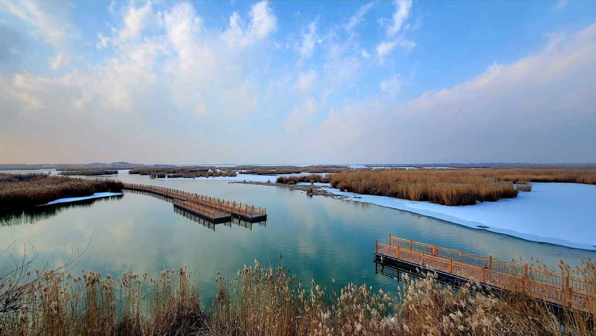 The Sand Lake in Shizuishan, Ningxia Hui autonomous region, reveals an avant-garde beauty in early winter. [Photo by Yue Changhong/Provided to chinadaily.com.cn]