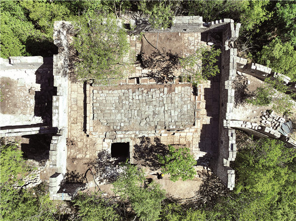 A bird's-eye view of remnants of the lookout tower at the Jiankou Great Wall from which archaeologists discovered traces of the color red. [Photo provided to China Daily]