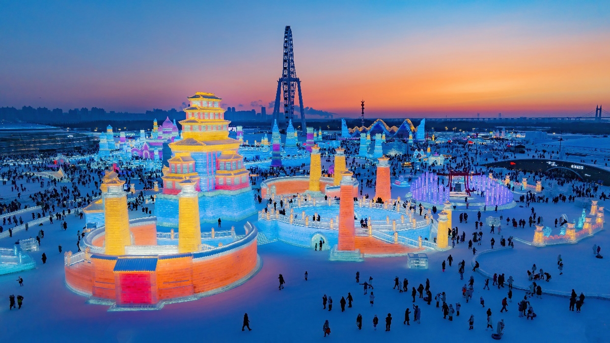 An aerial photo of the 25th Harbin Ice and Snow World landscape in Harbin, Heilongjiang province. [Photo provided to chinadaily.com.cn]