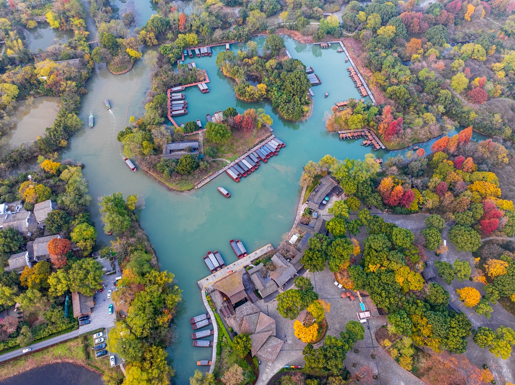 At Xixi Wetland National Park in Hangzhou, Zhejiang province, visitors enjoy boat rides through swaying reeds. From above, the wetlands take on a life of their own, with small boats gliding across waters, creating a poetic scene of serenity and beauty.