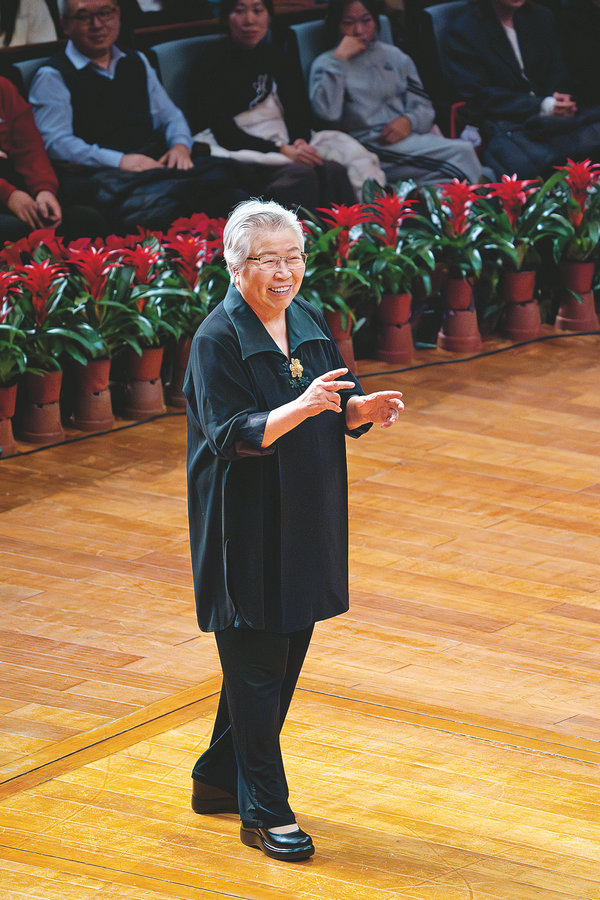 Wu Lingfen conducts the concert and interacts with performers at the China NCPA Chorus last Sunday. [Photo provided to China Daily]