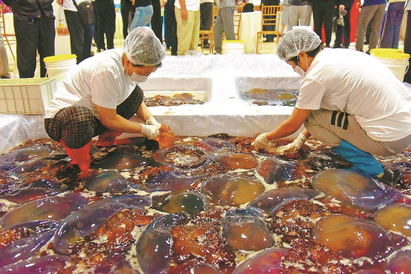 Each year the city produces on average 236,000 tons of processed jellyfish, with about 81 percent of the raw material coming from outside the city. The total output value of jellyfish processing is approximately 3 billion yuan ($413 million), data from local authorities showed.