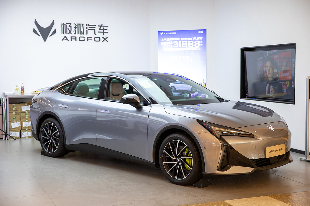 A visitor checks out an electric car made by Arcfox, an EV marque of BAIC Group, at a mall in Shanghai, Dec 15, 2024. [Photo/VCG]