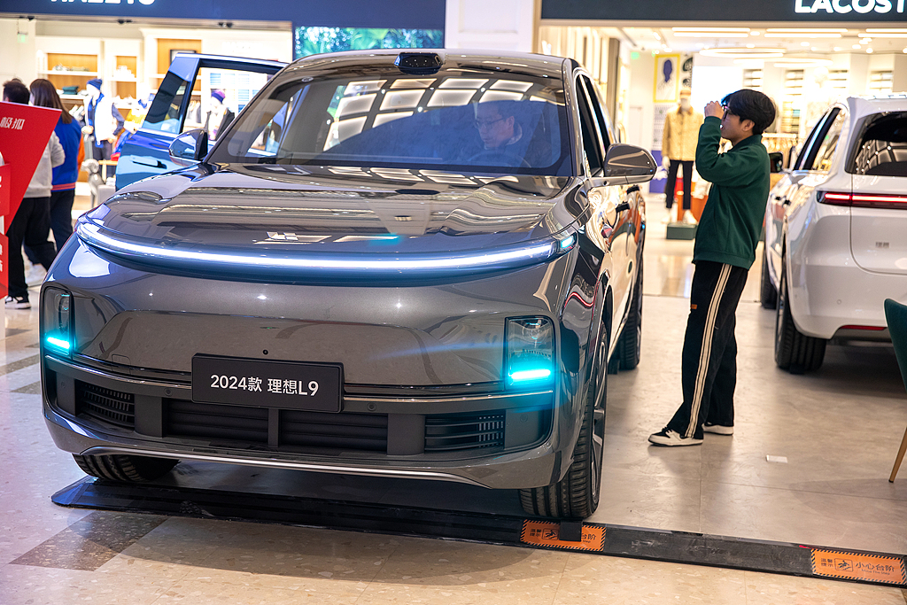 Customers take a closer look at Li Auto's L9 model at a mall in Shanghai, Dec 15, 2024. [Photo/VCG]